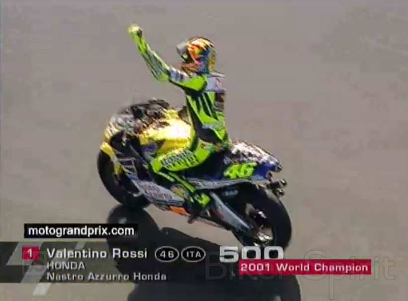 Το ημερολόγιο έγραφε 14 Οκτωβρίου 2001 όταν ο Valentino Rossi στέφθηκε Παγκόσμιος Πρωταθλητής 500cc, μετά από μια λαμπρή εμφάνιση σε έναν συναρπαστικό αγώνα στο Grand Prix της Αυστραλίας στο Phillip Island.