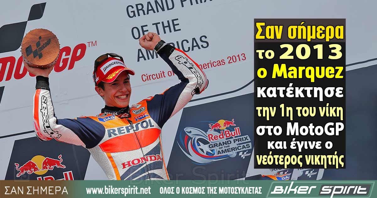 Ήταν 21 Απριλίου 2013, όταν ο Marquez στην πρώτη του χρονιά σαν rookies, πήρε την πρώτη του νίκη στην μεγάλη κατηγορία MotoGP, στην πίστα COTA στο Ωστιν της Αμερικής!