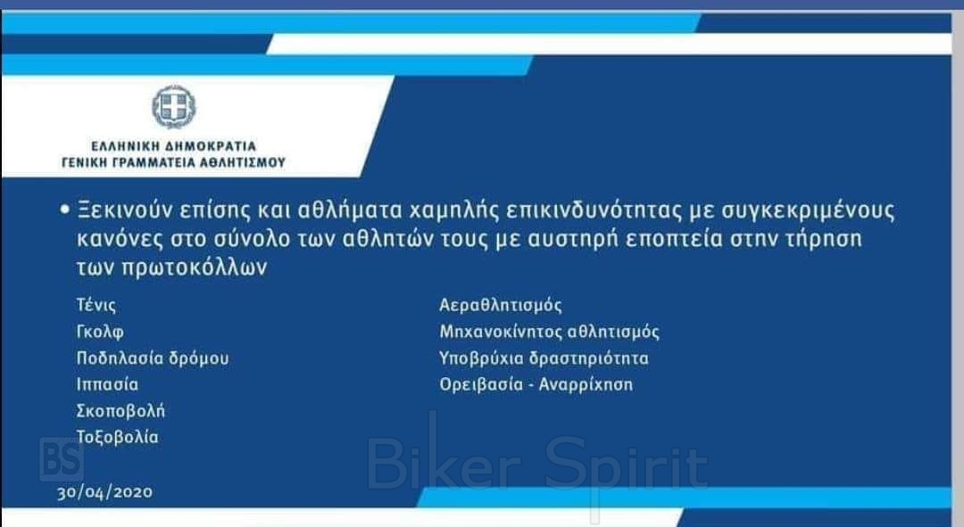 Στην ανακοίνωση της κυβέρνησης και του υφυπουργού Αθλητισμού, Λευτέρη Αυγενάκη, ο μηχανοκίνητος αθλητισμός παραλαμβάνεται στα αθλήματα χαμηλής επικινδυνότητας για την μετάδοση του κοροναϊού.