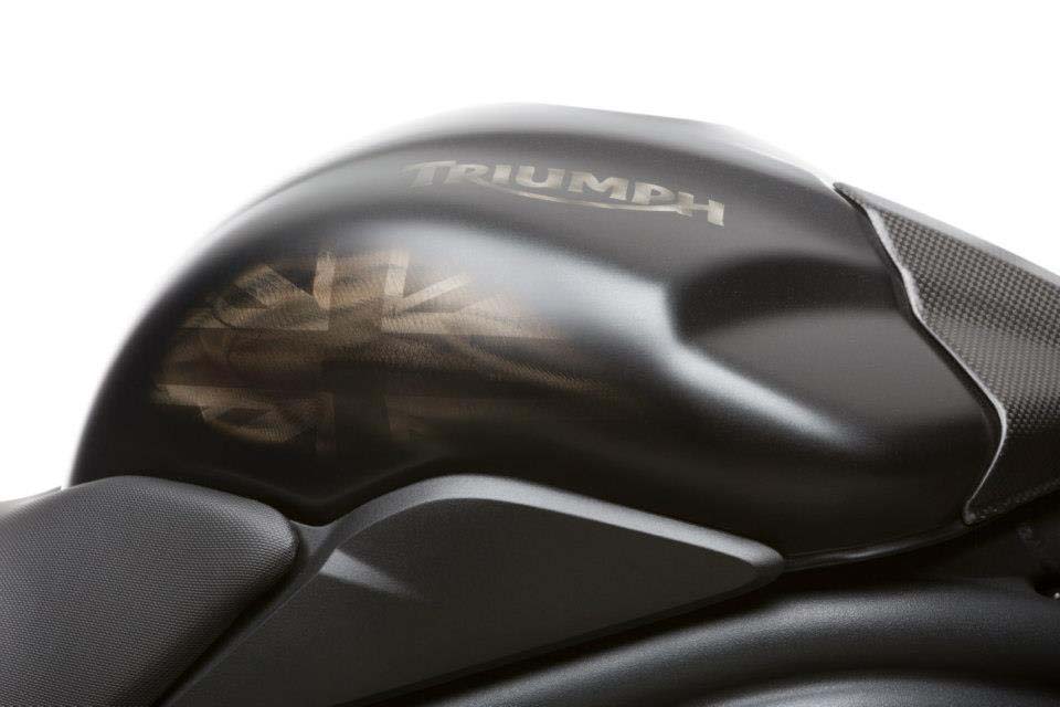 Η Triumph Speed Triple R “Dark” βγαίνει στην αγορά σε μαύρο χρώμα έχοντας πάνω της και κόκκινες λεπτομέρειες. Το λογότυπο με τον serial number βρίσκετε διακριτικά στο πάνω μέρος του ντεπόζιτου κοντά στη τιμονόπλακα ενώ αίσθηση προκαλεί και μια αερογραφία με την αγγλική σημαία στο πλαϊνό μέρος του ντεπόζιτου.