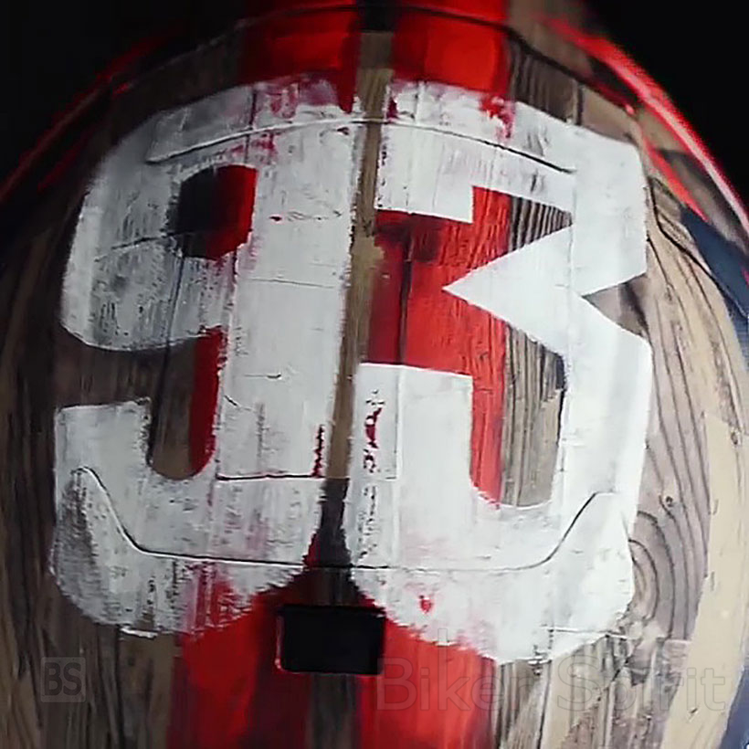 Εμπνευσμένο από την παράδοση του ροντέο, από τις ξύλινες αφίσες των αμερικανικών ράντσων. Με αυτή την έννοια, μαζί με το 93 και χωρίς να ξεχνάνε τις γραμμές της πίστα της Αμερικής, σχεδιάστηκε αυτό το ειδικό κράνος από την Dave Designs.