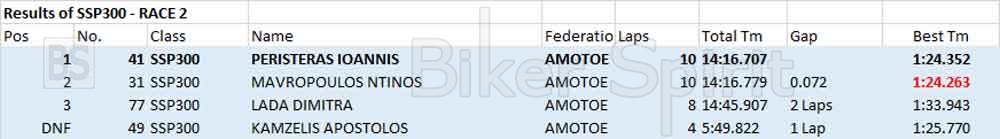 Ο Γιάννης Περιστεράς που στον χθεσινό 1ο αγώνα είχε πτώση, ξεκίνησε από την 13η θέση στην σχάρα εκκίνησης, και γρήγορα βρέθηκε στην κορυφη του αγώνα μαζί με τον Κωνσταντίνο Μαυρόπουλο, όπου έδωσαν μάχη μέχρι την καρό σημαία, με τον Περιστερά να περνά την γραμμή τερματισμού μόλις με 0.072s, μπροστά από τον Μαυρόπουλο σε έναν δικό τους αγώνα για την κορυφη!