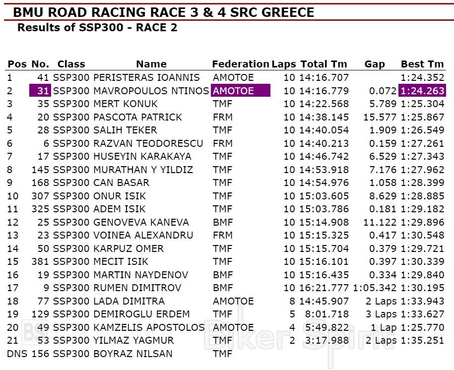 Με χρόνο 1.24.263 ο Μαυρόπουλος σημείωσε τον ταχύτερο γύρο του αγώνα που είναι και το ρεκόρ αγώνα για την κατηγορία, μόλις 0.00.123s από το απόλυτο ρεκόρ πίστας!