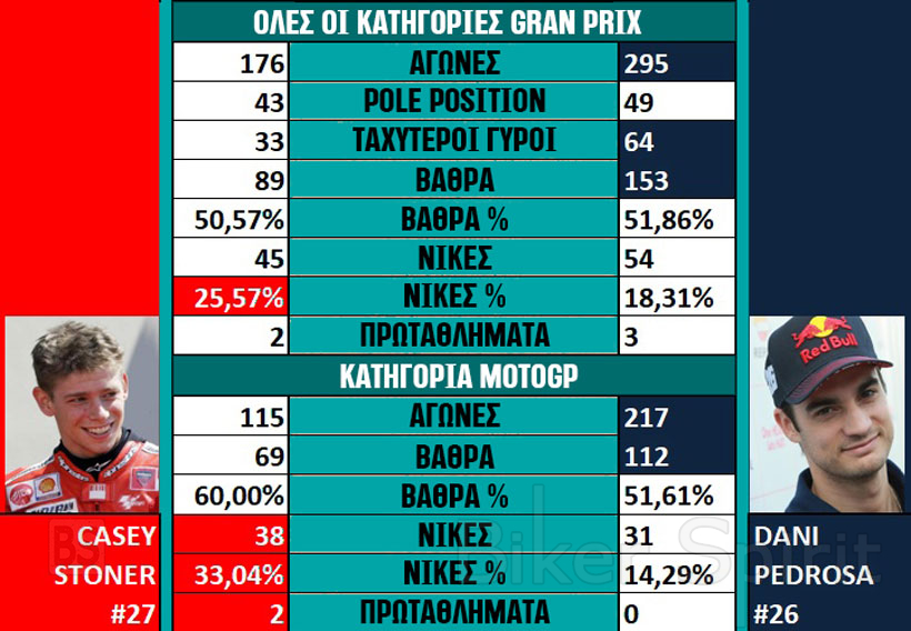 Όσον αφορά το MotoGP, ο Pedrosa αγωνίστηκε σχεδόν διπλάσιους αγώνας από τον Stoner, οπότε είναι ενδιαφέρον να αναλύσουμε τόσο τα συνολικά επιτεύγματα όσο και το ποσοστό επι τις %.