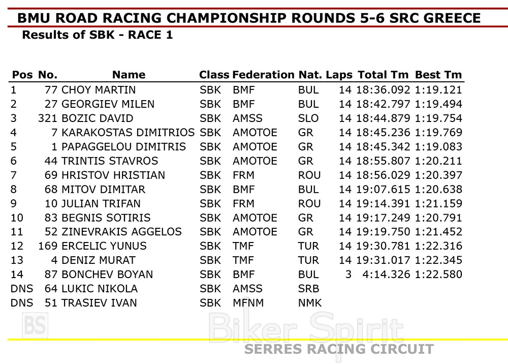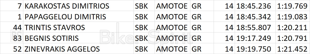 Στην 4η θέση του Ελληνικού τερμάτισε ο Σωτήρης Μπεγνής (YAMAHA R1), μπροστά από τον Άγγελο Ζινεβράκη (YAMAHA R1), ενώ στο Βαλκανικό τερμάτισαν στην 10η και 11η θέση αντίστοιχα.