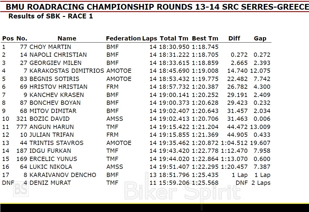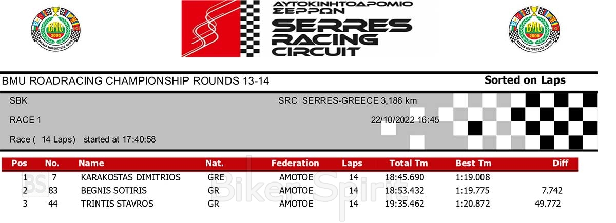 Στην 2η θέση τερμάτισε Σωτήρης Μπεγνής (YAMAHA R1) με διαφορά 7.742s πίσω από τον Καρακώστα, ενώ στο βαλκανικό τερμάτισε στην 5η θέση!