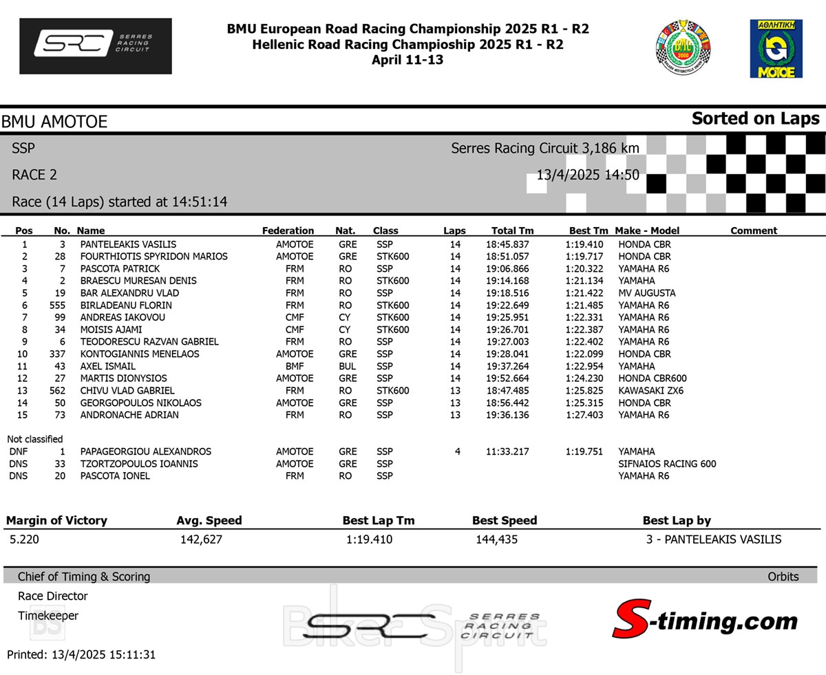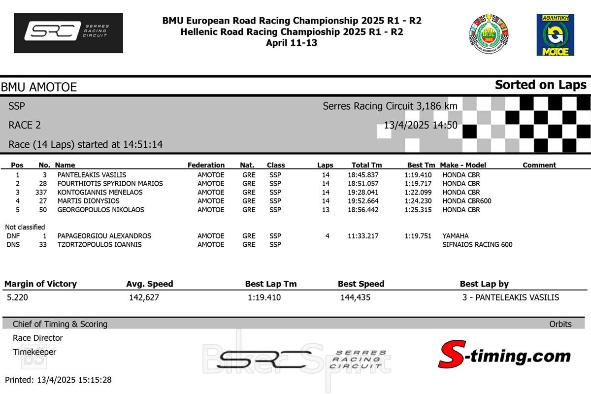 Το βάθρο συμπλήρωσε ο Μενέλαος Κοντογιάννης (HONDA CBR 600), ενώ στο BMU τερμάτισε στην 10η θέση.