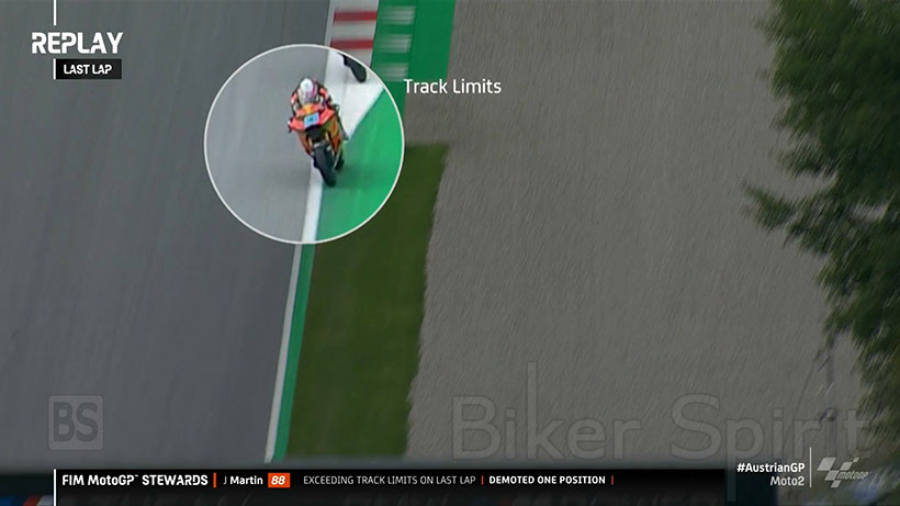 Σε έναν αγώνα, οι αναβάτες επιτρέπεται να βγουν εκτός ορίων της πίστας τρεις φορές πριν από την έκδοση προειδοποίησης, με την πέμπτη φορά να οδηγεί σε ποινή “μεγάλου γύρου” (Long Lap) – ενώ τα αδικήματα στον τελικό γύρο τιμωρούνται με πτώση μίας θέσης.