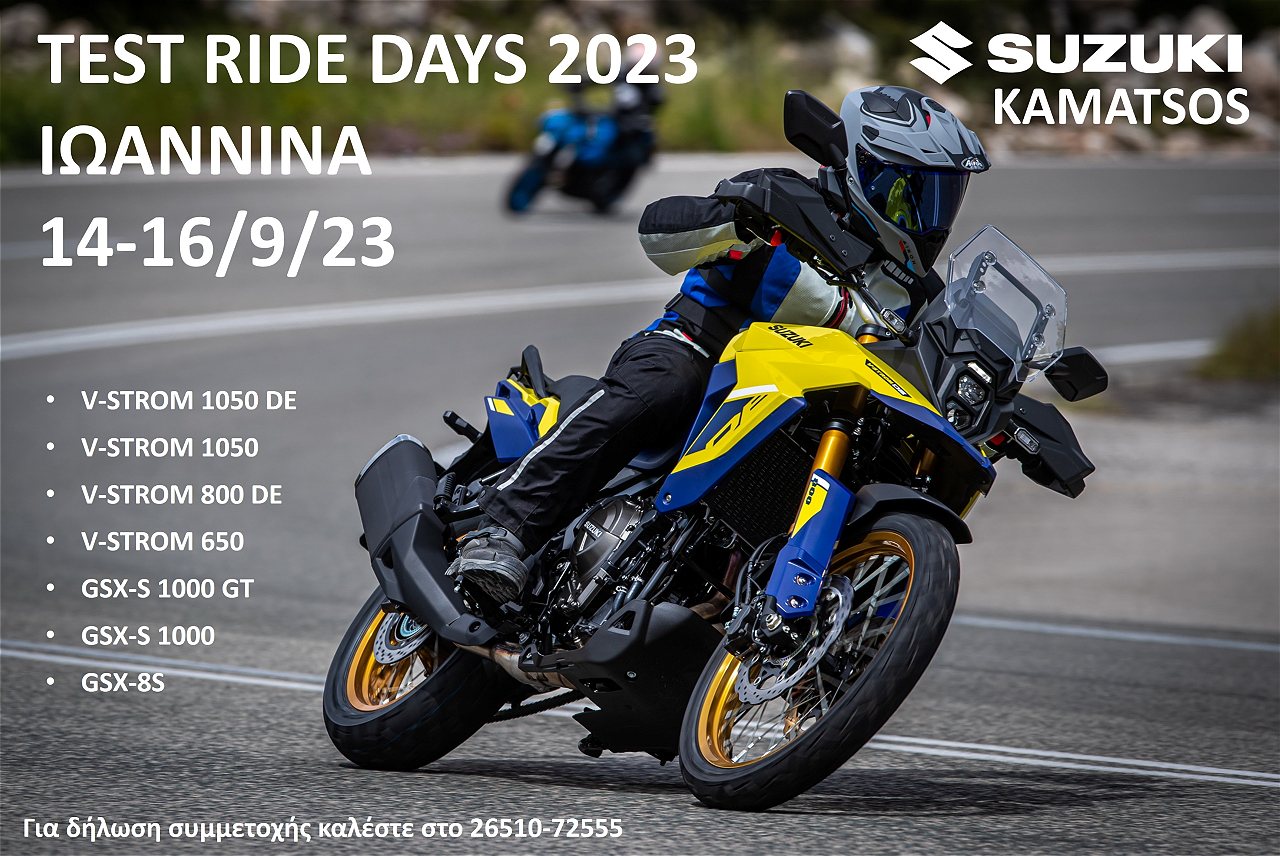 Από την Πέμπτη 14 έως και το Σάββατο 16 Σεπτεμβρίου ’23 θα διεξαχθούν test rides των Suzuki motorcycles στον επίσημο έμπορο KAMATSOS MOTO στα Ιωάννινα.