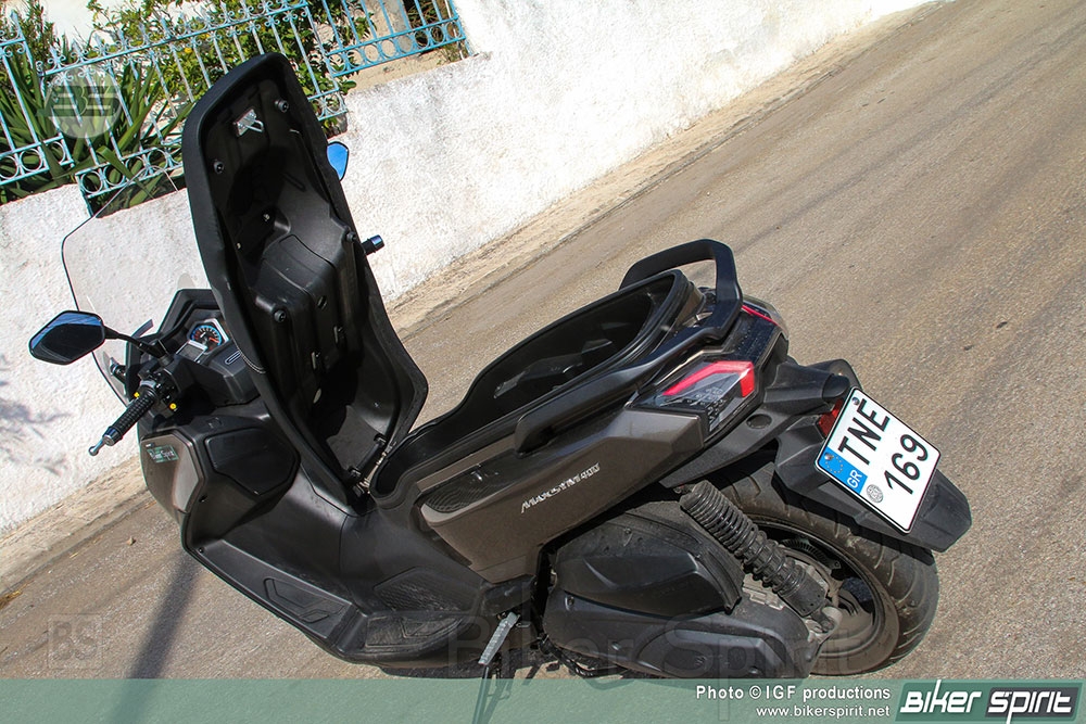 Έχει μεγάλους αποθηκευτικούς χώρους με δυο χρηστικά ντουλαπάκια κάτω από το τιμόνι στο εσωτερικό τμήμα της ποδιάς, βάθους 30cm, με τον έναν από αυτούς να διαθέτει παροχή φόρτισης USB QC 3.0 και επιπλέον έξυπνη θήκη στο πορτάκι, και έναν χώρο κάτω από τη σέλα, με άνοιγμα σε γωνία 45º, δίνοντας ευκολότερη πρόσβαση στο φωτιζόμενος χώρος 56 λίτρων κάτω από τη σέλα όπου τοποθετούνται άνετα 2 full face κράνη.