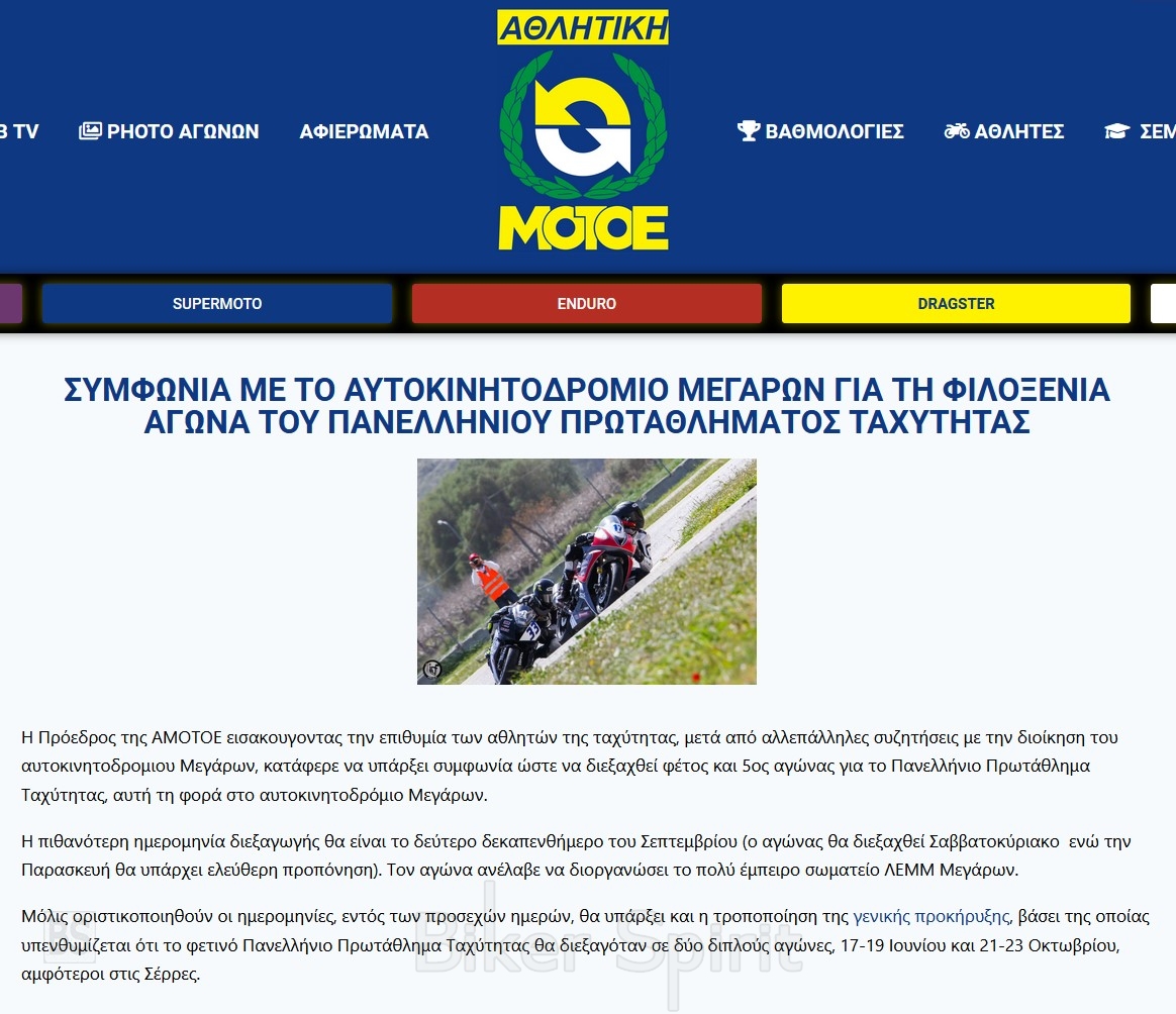 Η Πρόεδρος της ΑΜΟΤΟΕ εισακούγοντας την επιθυμία των αθλητών της ταχύτητας, μετά από αλλεπάλληλες συζητήσεις με την διοίκηση του αυτοκινητοδρομίου Μεγάρων, κατάφερε να υπάρξει συμφωνία ώστε να διεξαχθεί φέτος και 5ος αγώνας για το Πανελλήνιο Πρωτάθλημα Ταχύτητας, αυτή τη φορά στο αυτοκινητοδρόμιο Μεγάρων.