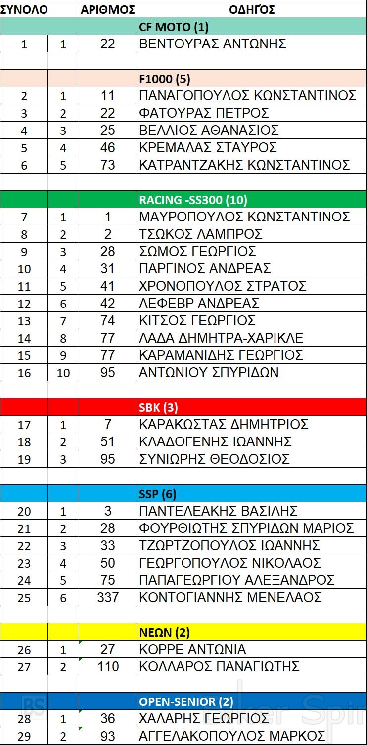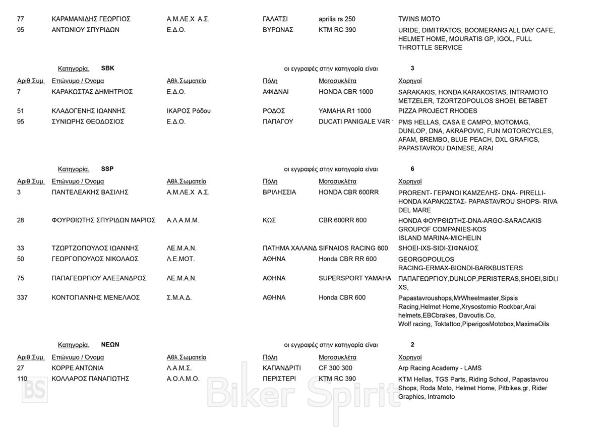 *Η παρακάτω λίστα είναι οι συμμετοχές που έχουν δοθεί στην ΑΜΟΤΟΕ μέχρι την Τρίτη το βράδυ στις 12.00 και φαίνονται στο σύστημα της ΑΜΟΤΕ. Αν υπάρχουν διπλές συμμετοχές, δηλαδή συμμετοχή του ιδίου οδηγού σε 2 κατηγορίες, το σύστημα δεν τους δείχνει. Επίσης κάποιοι οδηγοί μπορεί να δηλώσουν την συμμετοχή τους εκπρόθεσμα. Επίσης αν προκύπτουν περίεργες διαφοροποιήσεις στις συμμετοχές δεν είναι ευθύνη μας αλλα δυστυχώς συνεχίζουμε να μην έχουμε καμία ουσιώδης και επίσημη πληροφόρηση, παρα μόνο από το site της ΑΜΟΤΟΕ και όποιος καταλάβει κατάλαβε!