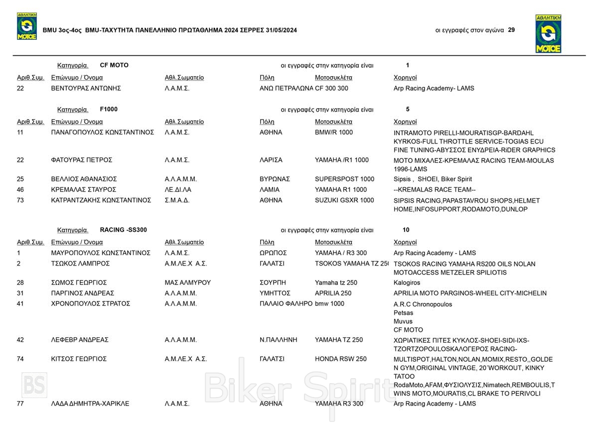 Επίσης βλέπουμε τον πολύπρωταθλητή Σάκη Συνιώρη που επέστρεψε στους αγώνες μετα από δυο χρονιά απουσίας (τελευταία φορά αγωνίστηκε στις 31/10/2021 στον 4ο αγώνα του ΠΠΤ στα Μέγαρα), ενώ τον είδαμε και πρόσφατα στον πρώτο διπλό αγώνα του BMU στις Σέρρες στις 13 και 14 Απριλίου 2024.