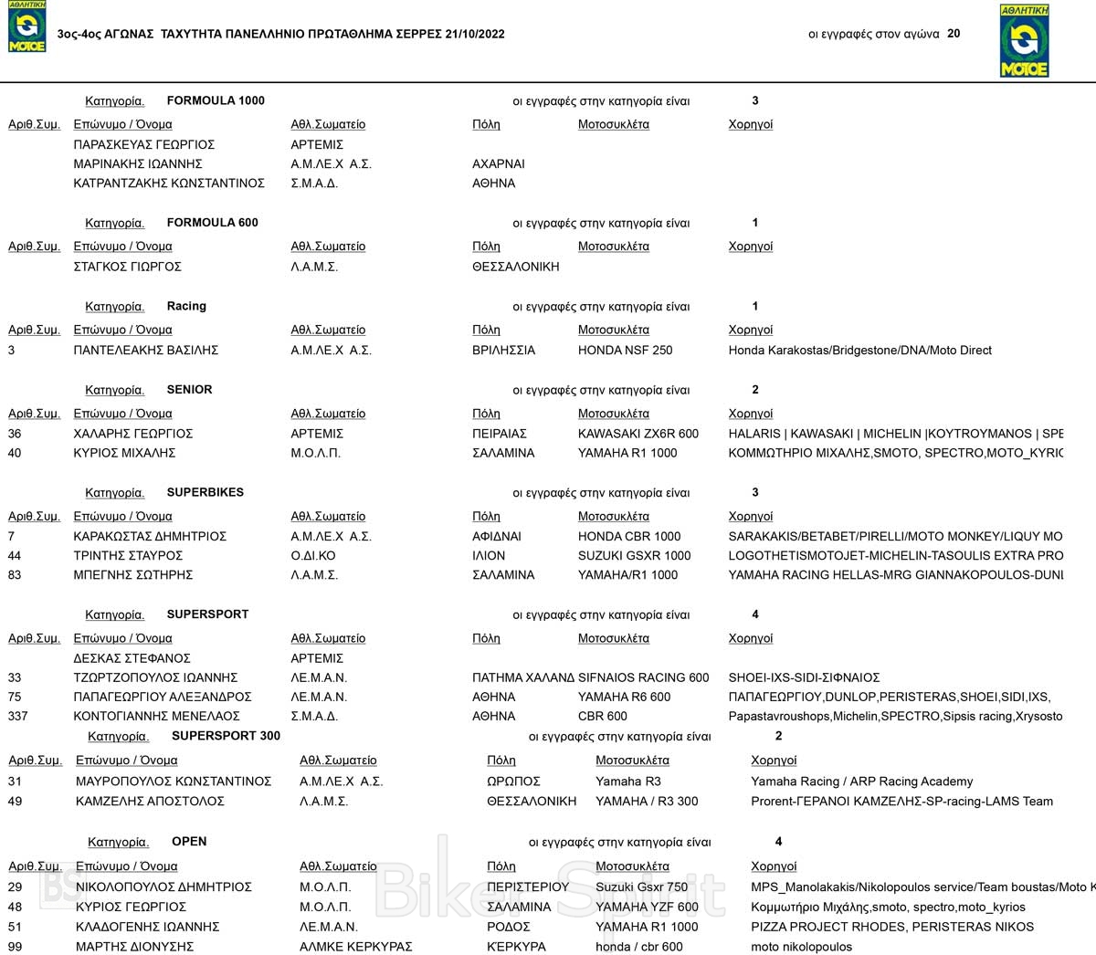 SUPERSPORT 300 : Συμμετοχές 2