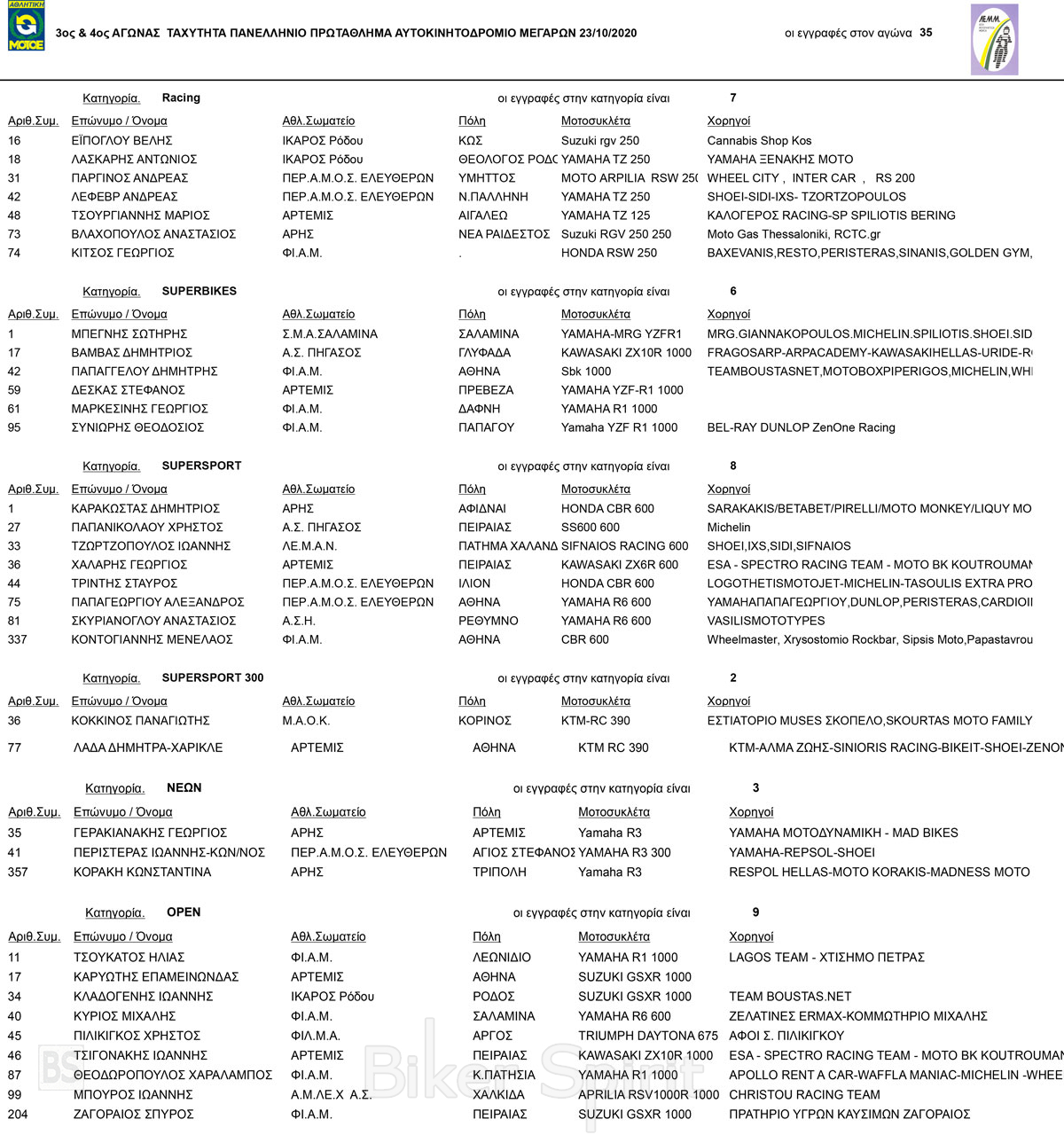 Στις 6 κατηγορίες που έχουμε φέτος βλέπουμε στην λίστα της ΑΜΟΤΟΕ στην OPEN έχει 9 συμμετοχές, στην Racing 7 συμμετοχές, ενώ στην κατηγορία SS300 που τρέχει μαζί με την Racing έχουμε 2 συμμετοχές, στην κατηγορία των Νέων έχουμε 3 συμμετοχές, ενώ η SUPERSPORT θα έχει 8 συμμετοχές και τέλος η μεγάλη κατηγορία SUPERBIKE έχει καταγεγραμμένες 6 συμμετοχές!