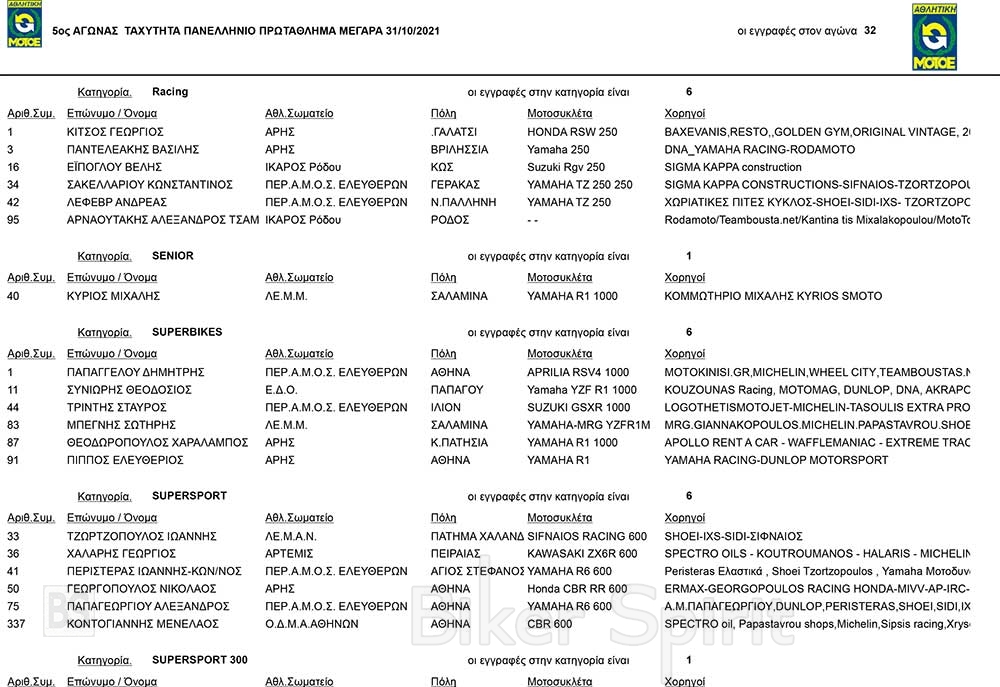 32 Συμμετοχές σε όλες τις κατηγορίες που έχουμε φέτος, έτσι βλέπουμε στην λίστα της ΑΜΟΤΟΕ στην OPEN έχει 12 συμμετοχές, 1 συμμετοχή στην κατηγορία Senior, στην Racing 6 συμμετοχές, ενώ στην κατηγορία SS300 που τρέχει μαζί με την Racing έχουμε 1 συμμετοχές, στην κατηγορία των Νέων δεν έχουμε συμμετοχές, ενώ η SUPERSPORT θα έχει 6 συμμετοχές και τέλος η μεγάλη κατηγορία SUPERBIKE έχει καταγεγραμμένες 6 συμμετοχές!