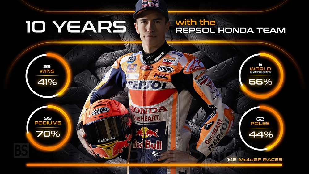Μέχρι σήμερα, ο Marc Márquez και η Repsol Honda Team έχουν πετύχει 62 poles, 99 βάθρα, 59 νίκες και έξι παγκόσμια πρωταθλήματα μαζί – η καθοριστική δύναμη στα τελευταία δέκα χρόνια των αγώνων μοτοσικλέτας Grand Prix. Το κίνητρο και η φιλοδοξία παραμένουν τόσο υψηλά όσο ποτέ για τον συνδυασμό, καθώς στοχεύουν να γιορτάσουν τη δεκαετία τους μαζί με τον καλύτερο δυνατό τρόπο, κατακτώντας για άλλη μια φορά το Παγκόσμιο Πρωτάθλημα MotoGP.