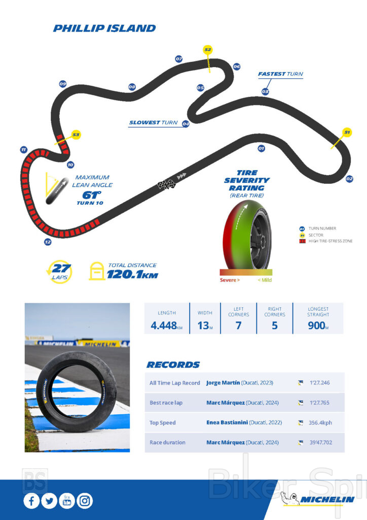 - Ως ασύμμετρη πίστα από τη φύση της, το Phillip Island ασκεί εξαιρετική πίεση στην αριστερή πλευρά των ελαστικών – ειδικά στα πίσω – λόγω των μεγάλων, γρήγορων στροφών και των συνήθως δροσερών, θυελλωδών καιρικών συνθηκών.