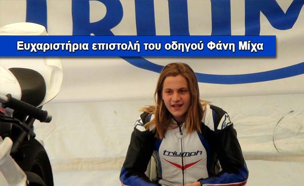 ΔΕΛΤΙΑ ΤΥΠΟΥΠαν.Πρ.Ταχ. 2016 Ευχαριστήρια επιστολή του οδηγού της Supersport Φάνη Μίχα 19 May 2016 BikerSpirit SUPERSPORT, Ευχαριστήρια επιστολή, Παν.Πρ.Ταχ. 2016, Φάνης Μίχας 2 min read Share this: Click to share on Facebook (Opens in new window) Facebook Click to share on X (Opens in new window) X Click to share on LinkedIn (Opens in new window) LinkedIn Click to print (Opens in new window) Print More Click to share on Reddit (Opens in new window) Reddit Click to share on Tumblr (Opens in new window) Tumblr Click to share on Pocket (Opens in new window) Pocket Click to share on Pinterest (Opens in new window) Pinterest Read More
