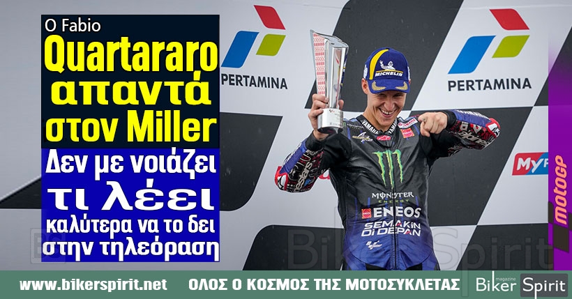 MotoGP 2022 Ο Fabio Quartararo απαντά στον Miller: “Δεν με νοιάζει τι λέει, καλύτερα να το δει στην τηλεόραση” 20 March 2022 BikerSpirit #IndonesianGP2022, IndonesianGP, Indonisia, Mandalika, MICHELIN, MotoGP, MotoGP2022, Ινδονησία 1 min read Share this: Share on Facebook (Opens in new window) Facebook Share on X (Opens in new window) X Share on LinkedIn (Opens in new window) LinkedIn Print (Opens in new window) Print More Share on Reddit (Opens in new window) Reddit Share on Tumblr (Opens in new window) Tumblr Share on Pinterest (Opens in new window) Pinterest Read More