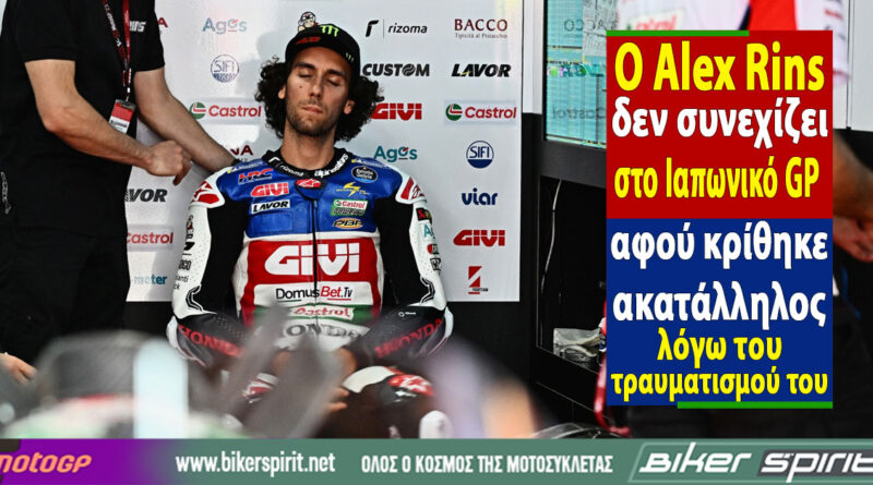 MotoGP 2023 Ο Alex Rins δεν συνεχίζει στο GP της Ιαπωνίας, αφού κρίθηκε ακατάλληλος λόγω του τραυματισμού του 30 September 2023 BikerSpirit #JapaneseGP, #JapaneseGP2023, JAPAN, Japanese, Motegi, MotoGP, MotoGP2023, Ιαπωνία 1 min read Share this: Click to share on Facebook (Opens in new window) Facebook Click to share on X (Opens in new window) X Click to share on LinkedIn (Opens in new window) LinkedIn Click to print (Opens in new window) Print More Click to share on Reddit (Opens in new window) Reddit Click to share on Tumblr (Opens in new window) Tumblr Click to share on Pocket (Opens in new window) Pocket Click to share on Pinterest (Opens in new window) Pinterest Read More
