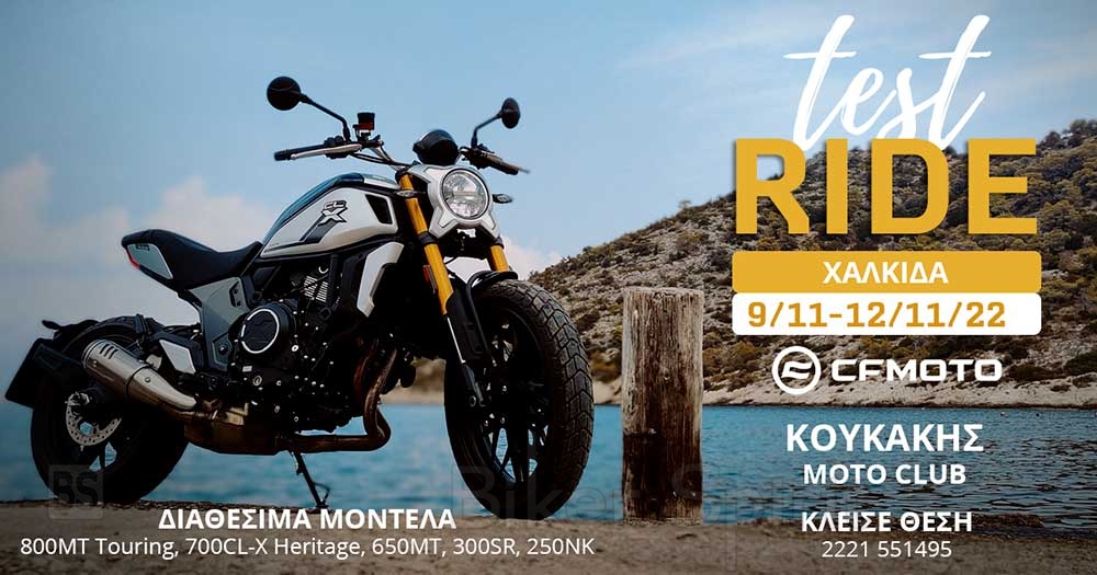 Η CFMOTO ενημερώνει ότι όλα της τα μοντέλα θα είναι διαθέσιμα για Test Ride στη Χαλκίδα στις 9 – 12 Νοεμβρίου 2022, στην εταιρεία ΚΟΥΚΑΚΗΣ ΜΟΤΟ CLUB, Αρεθούσης 38, ΤΚ 34100 τηλ.: 2221551495 και email: gkoukakis@hotmail.com