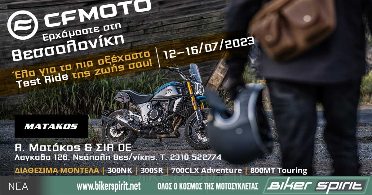 Η CFMOTO Hellas ενημερώνει ότι τα μοντέλα 300NK, 300SR, 700CLX Adventure και 800MT Touring θα είναι διαθέσιμα για Test Ride στην Θεσσαλονίκη στις 12 – 16 Ιουλίου 2023, στην εταιρεία Α. ΜΑΤΑΚΟΣ & ΣΙΑ ΟΕ, Λαγκαδά 126, ΤΚ 56727