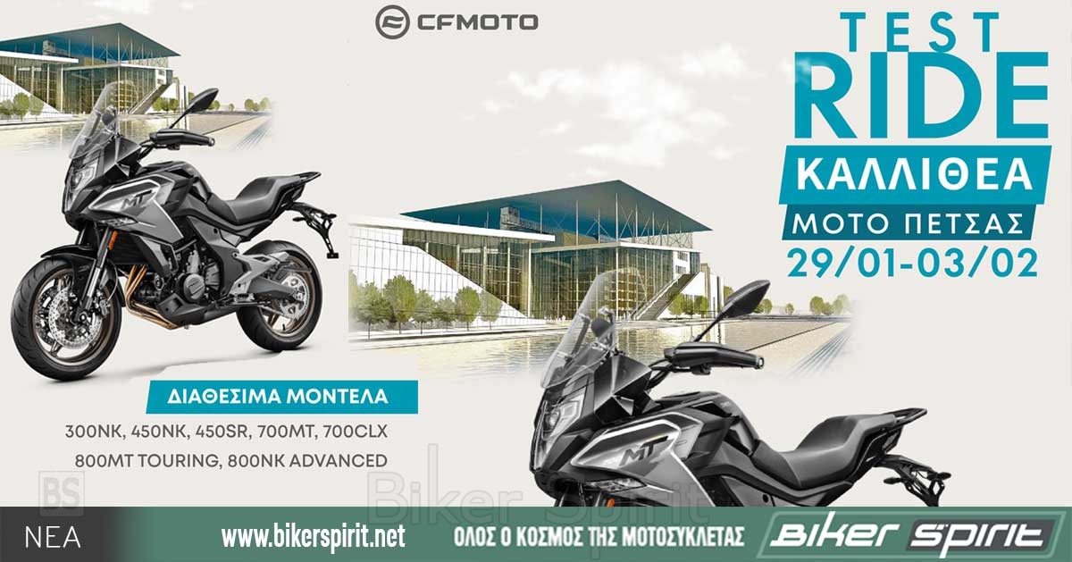 Η MUVUS, Επίσημος Εισαγωγέας CFMOTO στην Ελλάδα, ενημερώνει ότι από 29/01/2024 έως 03/02/2024 θα πραγματοποιηθεί Test Ride στην εταιρεία ΜΟΤΟ ΠΕΤΣΑ, Λ. Ελευθερίου Βενιζέλου 242, Καλλιθέα, ΤΚ 17676 Τηλ 210 9582988.