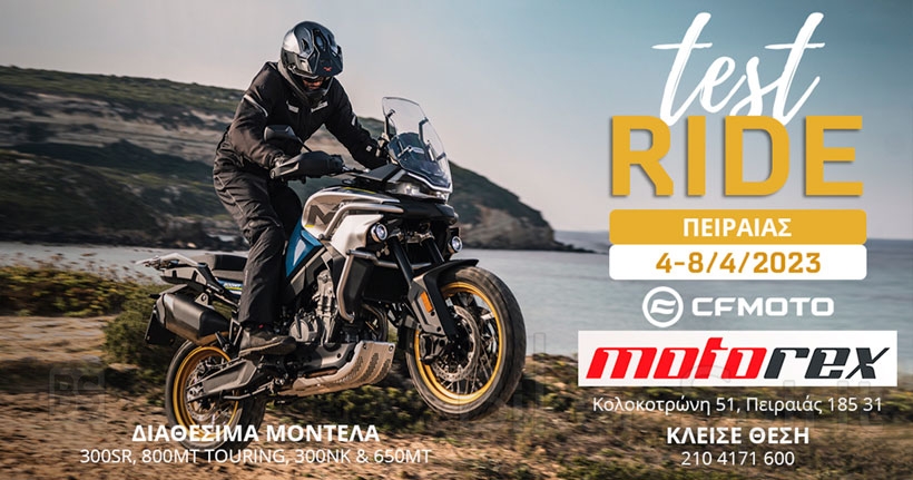 Η CFMOTO Hellas ενημερώνει ότι τα μοντέλα 800ΜΤ Τouring, 300ΝΚ, 650ΜΤ και 300SR θα είναι διαθέσιμα για Test Ride στον Πειραιά στις 04 – 08 Απριλίου 2023, στην εταιρεία MOTOREX, Κολοκοτρώνη 51, ΤΚ 18531 τηλ.: 2104171600 και email: info@motorex.gr
