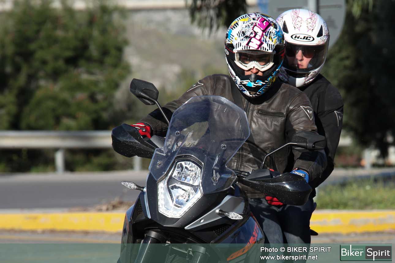 Κινηθήκαμε στην εθνική για να δούμε την μοτοσικλέτας σε συνθήκες ταξιδιού. Ρυθμίσαμε την ζελατίνα στο πιο ψηλό της σημείο μιας και το ύψος του αναβάτη ήταν 1.85 , η προστασία από τον αέρα είναι καλή για λίγο πιο κοντό αναβάτη, αφού ο αέρας σε εμάς είχε κάποιους στροβιλισμούς στη κορυφή του κράνους, χωρίς βέβαια να είναι ενοχλητικό.