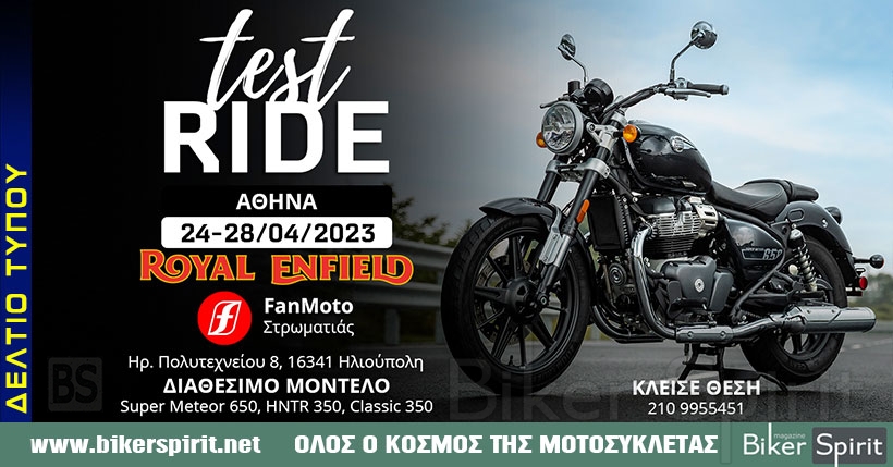Η ROYAL ENFIELD Hellas ενημερώνει ότι τα μοντέλα SUPER METEOR 650, CLASSIC 350 και HNTR 350 θα είναι διαθέσιμες Test Ride στην εταιρεία Fanmoto, από τις 24 έως 28 Απριλίου 2023.