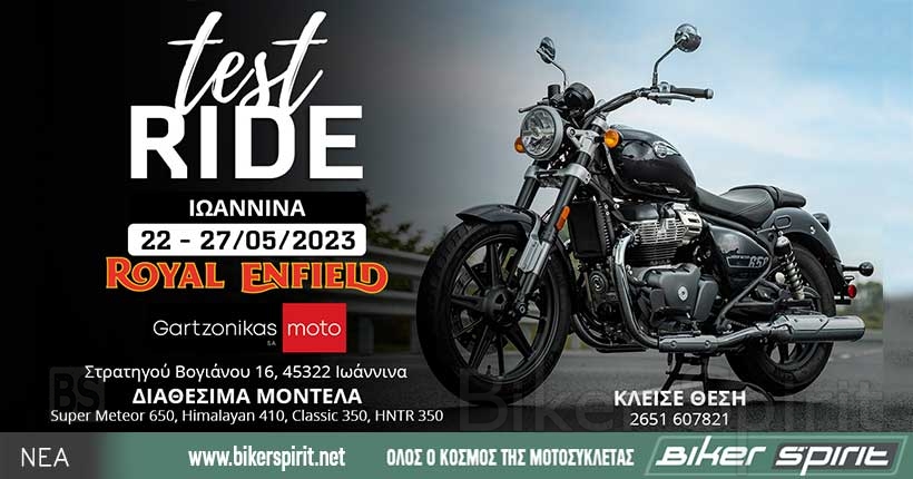 Η Royal Enfield Hellas ενημερώνει ότι τα μοντέλα Super Meteor 650, Himalayan 410, HNTR 350 και Classic 350 θα είναι διαθέσιμα για Test Ride στα Ιωάννινα στις 22 – 27 Μαΐου 2023, στην εταιρεία Gartzonikas Moto, Στρατηγού Βογιάνου 16, ΤΚ 45322 τηλ.: 2651607821 και email: moto@gartzonikas.gr