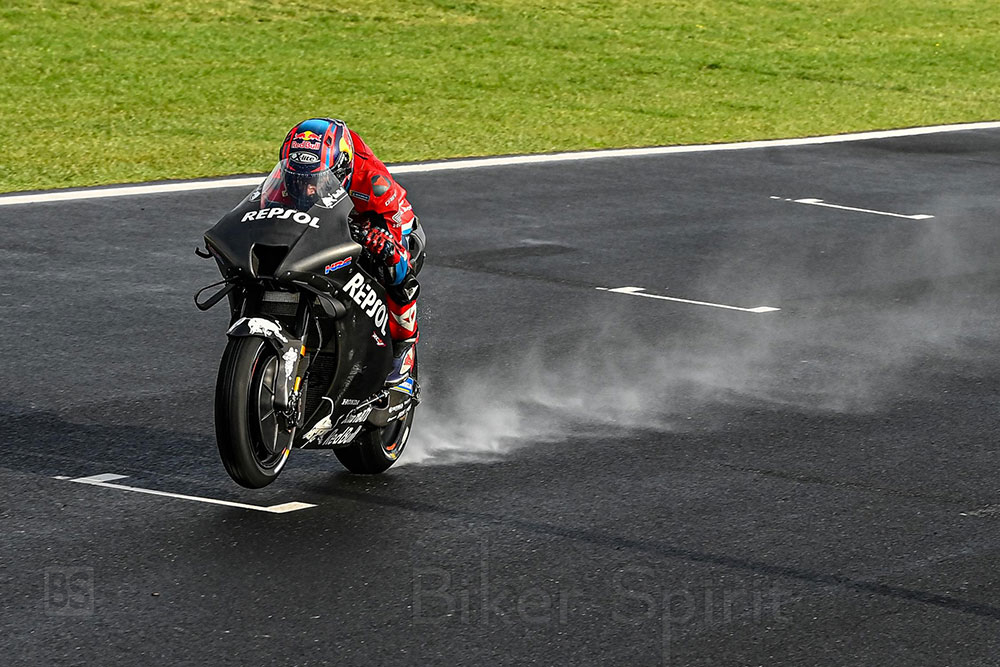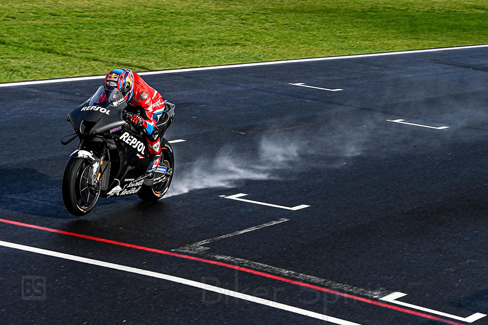 Η πίστα ειναι βρεγμένη μετά από ολονύκτια βροχή, αλλά ο οδηγός δοκιμών του HRC, Bradl έχει ήδη μπει μέσα στην πίστα με ένα RC213V προδιαγραφών 2022