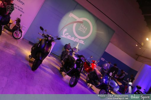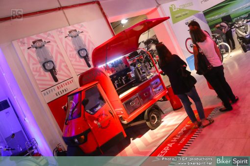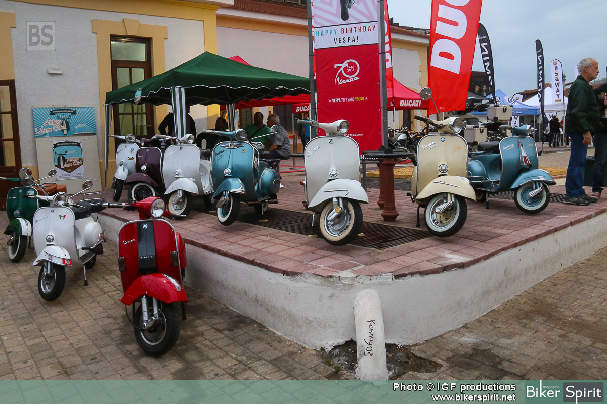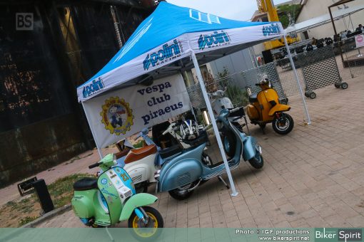Στον εξωτερικό χώρο της αίθουσας, οι κλασικές vespes του Athens Vespa Club στολίζουν τον χώρο σε ένα εορταστικό κλίμα για τον εορτασμό των 70 χρόνων της Vespa. Το ίδιο κλίμα αντικρίζει κανείς και στον εσωτερικό χώρο όπου εκτίθενται ολοκαίνουργια μοντέλα Vespa στην δεξιά πλευρά.