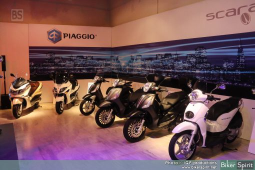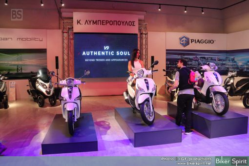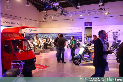 Η αίθουσα που φιλοξένει την Piaggio Hellas είναι ίσως η μεγαλύτερη αίθουσα της έκθεσης, και δε θα μπορούσε να είναι και αλλιώς αλώστε, αφού πρέπει να φιλοξενήσει μοτοσυκλέτες από επτά εταιρίες, Aprilia, Scarabeo, Piaggio, Vespa, Gilera, Moto Guzzi και Derbi.