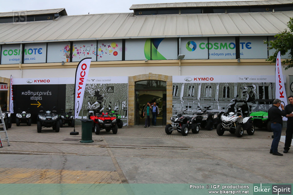 Δεξιά από το κτίριο όπου στεγάζονται τα μοντέλα της ΥΑΜΑΗΑ, βρίσκετε η Kymco, η οποία έχει στολίσει τον εξωτερικό της χώρο με την σειρά των ATV της με μικρά και πιο θηριώδες τετράροδα.