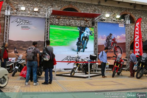 Η Honda, είναι εκεί με δυναμική παρουσία. Στον εξωτερικό χώρο της αίθουσας της Honda δεσπόζει η ολοκαίνουργια και πολυαναμενόμενη CRF 1000L Africa Twin σε όλες τις εκδόσεις και τους χρωματισμούς της.