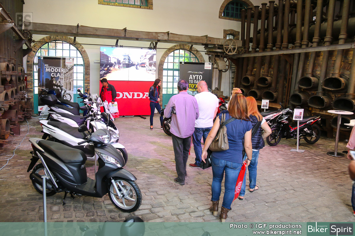Μπαίνοντας μέσα στην αίθουσα της Honda, αντικρίζεις στο κέντρο το mega scooter της εταιρίας Integra S αλλά και τα μικρότερα SH 125/300, PCX 150 και Forza 300, ενώ δεξιότερα μπορεί κανείς να πάρει μια ιδέα από τα παπιά της εταιρίας, όπως το νέο Wave 110i, το Supra-X 125 HELMIN αλλά και το ASTREA GRAND 110.