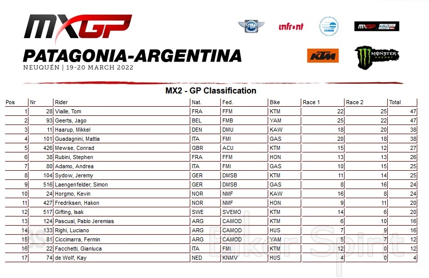 Στην MX2 ο Tom Vialle της Red Bull επιτέλους επέστρεψε στην κορυφή, μετά από μερικές δύσκολες εβδομάδες. Το βάθρο της ημέρας συμπλήρωσαν οι Jago Geerts (BEL, YAM) και Mikkel Haarup (DEN, KAW).