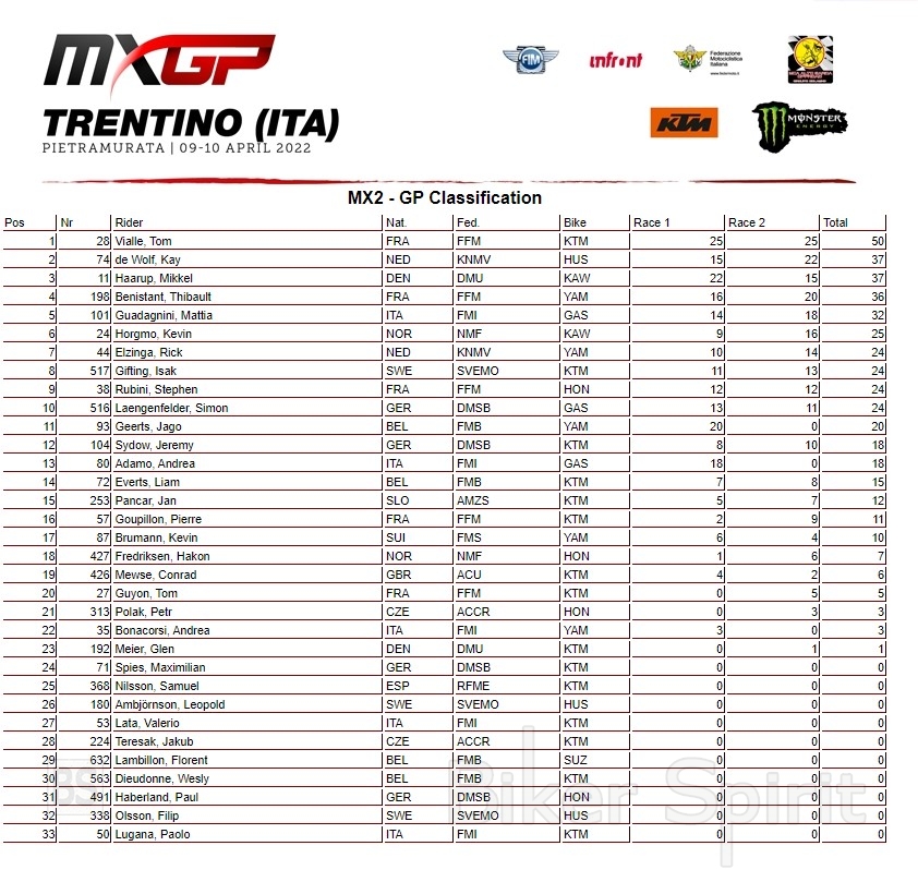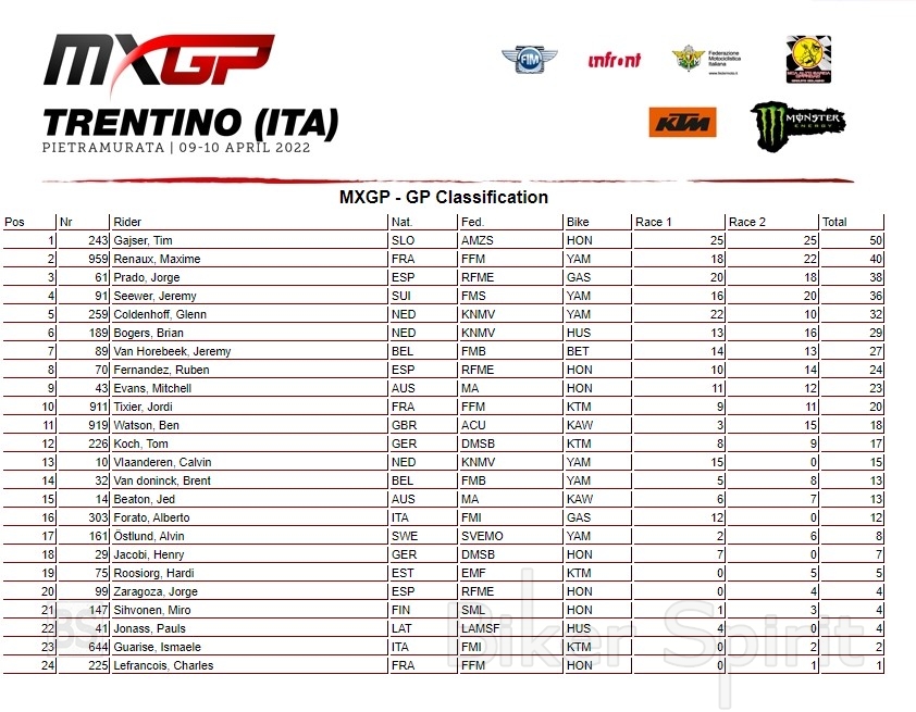 Ήταν το πρώτο 1-1 για τον Gajser στη σεζόν, νίκες και στα δυο σκέλη! Ο Renaux γιόρτασε την επιστροφή του στο βάθρο με την δεύτερη θέση στη γενική, με τον Prado να κατακτά το τρίτο σκαλί του βάθρου.