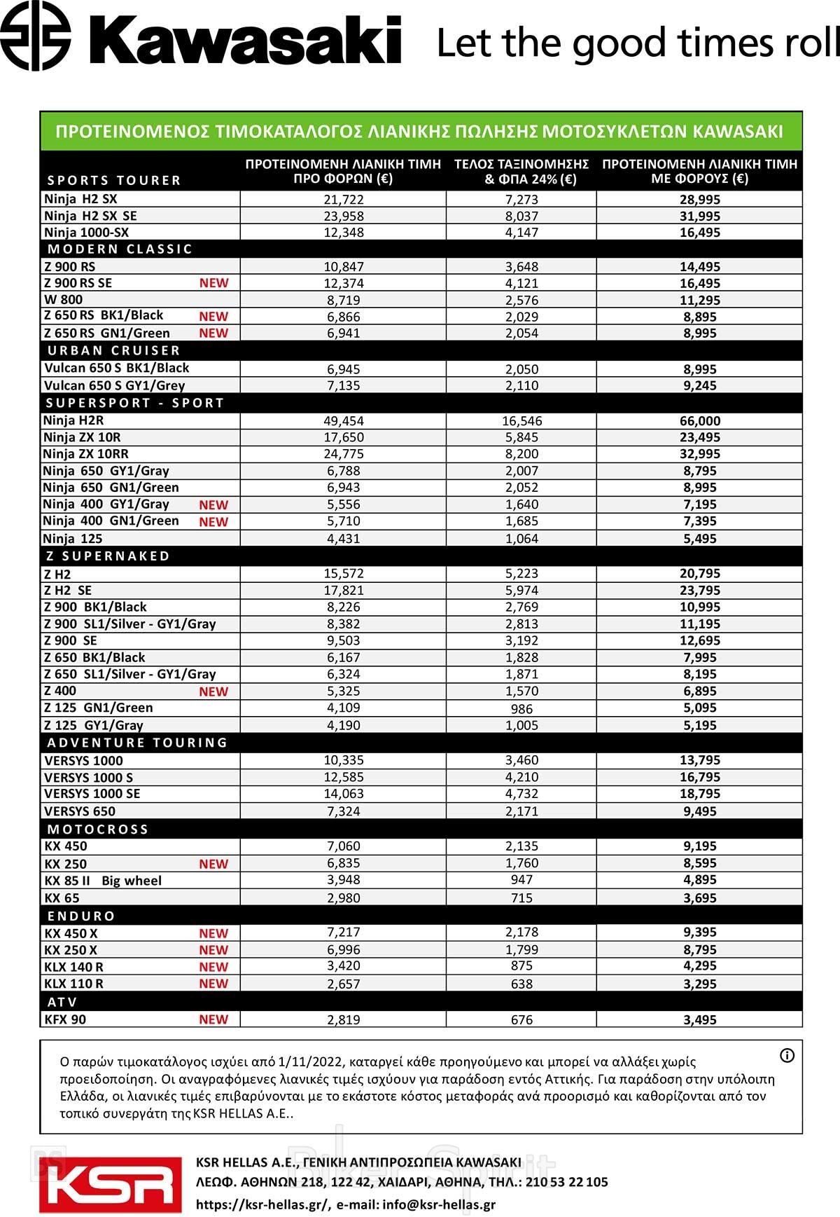 Η KSR Hellas S.A ανακοίνωσε τον νέο τιμοκατάλογο προτεινόμενης λιανικής 2023 για τις μοτοσυκλέτες της Kawasaki, με όλα τα νέα της μοντέλα που τίθεται σε ισχύ τη 1 Νοεμβρίου 2022.