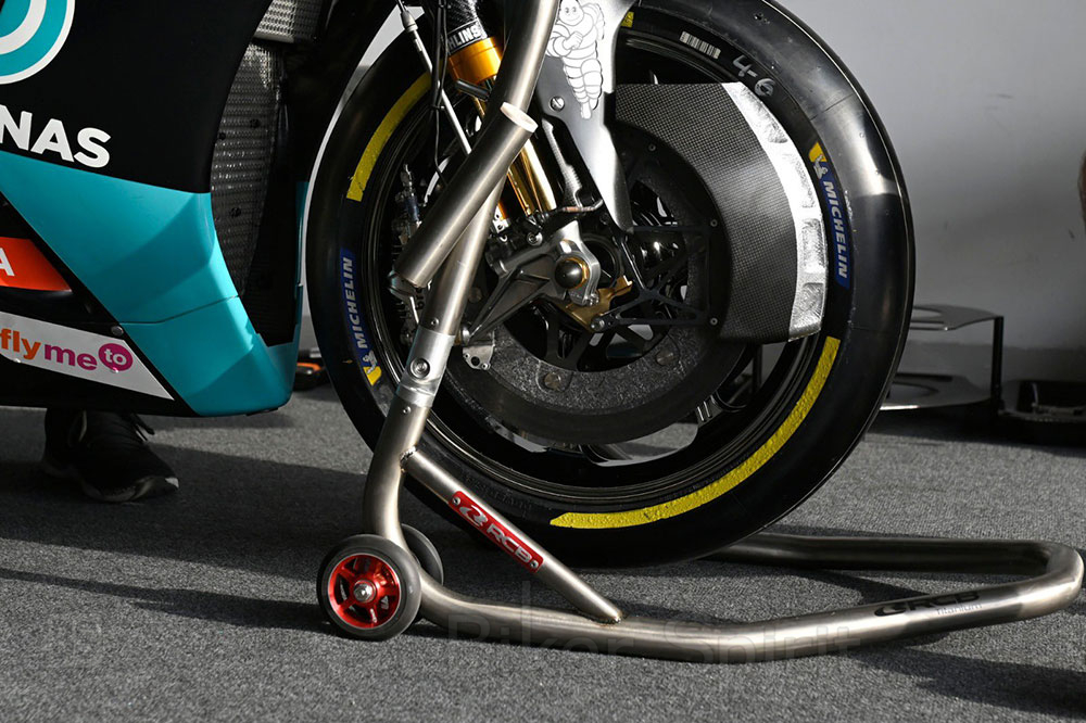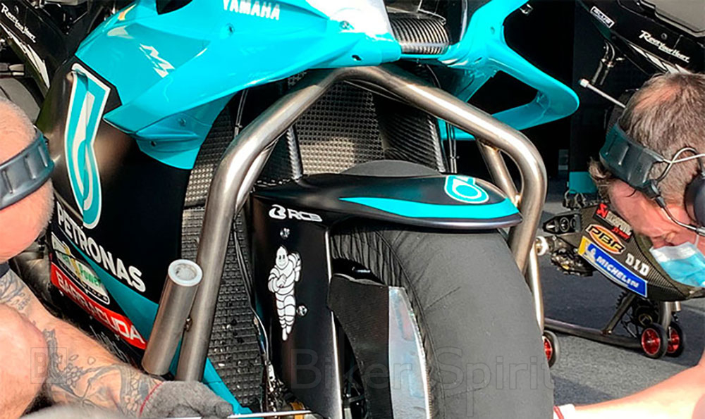 Επιπλέον, ο Rossi δοκιμάζει έναν νέο σχεδιασμένο διαχύτη που είναι εγκατεστημένος στους δίσκους άνθρακα της Yamaha του που φαίνεται να κόβει ακόμη περισσότερο τον αέρα που δέχεται εκείνη την περιοχή της μοτοσυκλέτας. Στις φωτογραφίες μπορείτε επίσης να δείτε δύο κομμάτια ινών άνθρακα τοποθετημένα στα πόδια του πιρουνιού που αναζητούν επίσης καλύτερο συντελεστή οπισθέλκουσας στο M1.