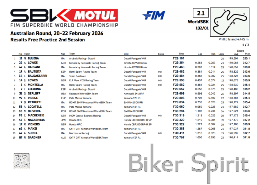Η ευχάριστη έκπληξη της ημέρας ήρθε από το στρατόπεδο της Bimota. Ο Alex Lowes κατέκτησε τη δεύτερη θέση στo FP2, μόλις 0,253 δευτερόλεπτα πίσω από τον Bulega, παρά την πτώση του στη K4. Σηκώθηκε, επέστρεψε στην πίστα και απάντησε με χρόνο που τον έβαλε στην κορυφή.