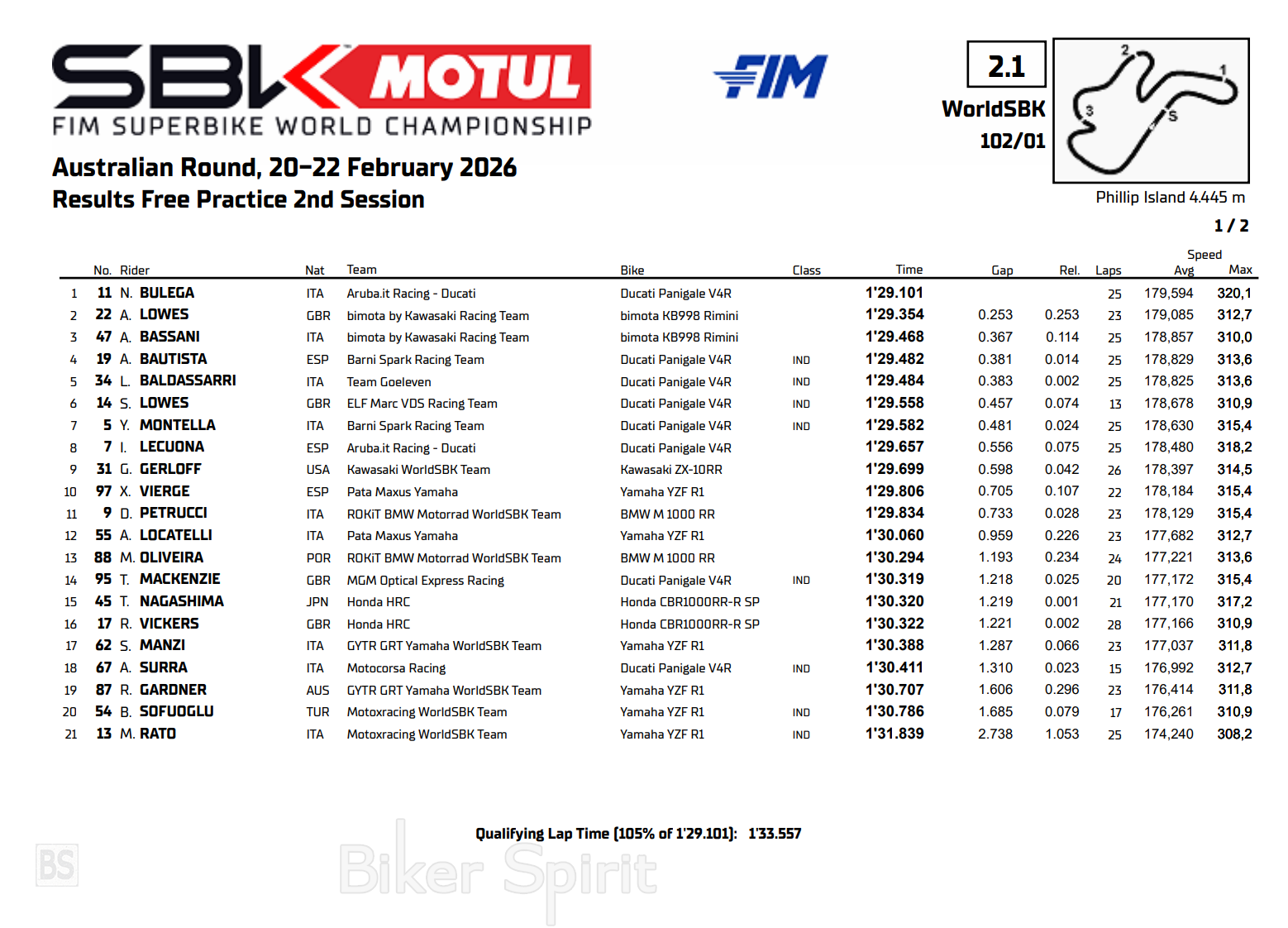 Δίπλα του, ο Axel Bassani συμπλήρωσε την κορυφαία τριάδα, επιβεβαιώνοντας ότι η ιταλική κατασκευάστρια βρίσκεται σε εξαιρετική φόρμα. Δύο Bimota στις πρώτες θέσεις στο Phillip Island; Λίγοι θα το προέβλεπαν πριν ξεκινήσει το τριήμερο. Από την άλλη, ο Sam Lowes είχε πτώση στη Κ1 περίπου 15 λεπτά πριν το τέλος του FP2. Ευτυχώς, χωρίς σοβαρές συνέπειες, όμως η διακοπή του ρυθμού του δεν του επέτρεψε να χτίσει κάτι καλύτερο.