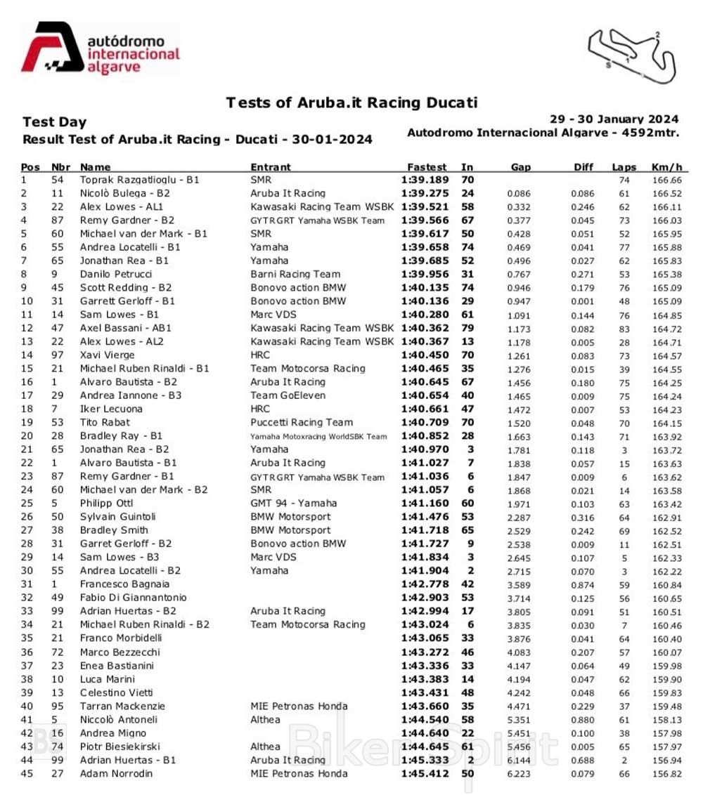Οκτώ αναβάτες έμειναν κάτω από 1:40 λεπτά τις δύο ημέρες: Εκτός από τους Razgatlioglu και Bulega, αυτοί είναι οι Alex Lowes (Kawasaki), Remy Gardner (GRT Yamaha), Michael van der Mark (ROKiT BMW), Andrea Locatelli και Jonathan Rea ( τόσο η Pata Yamaha). ) και ο Danilo Petrucci (Barni Spark Ducati).