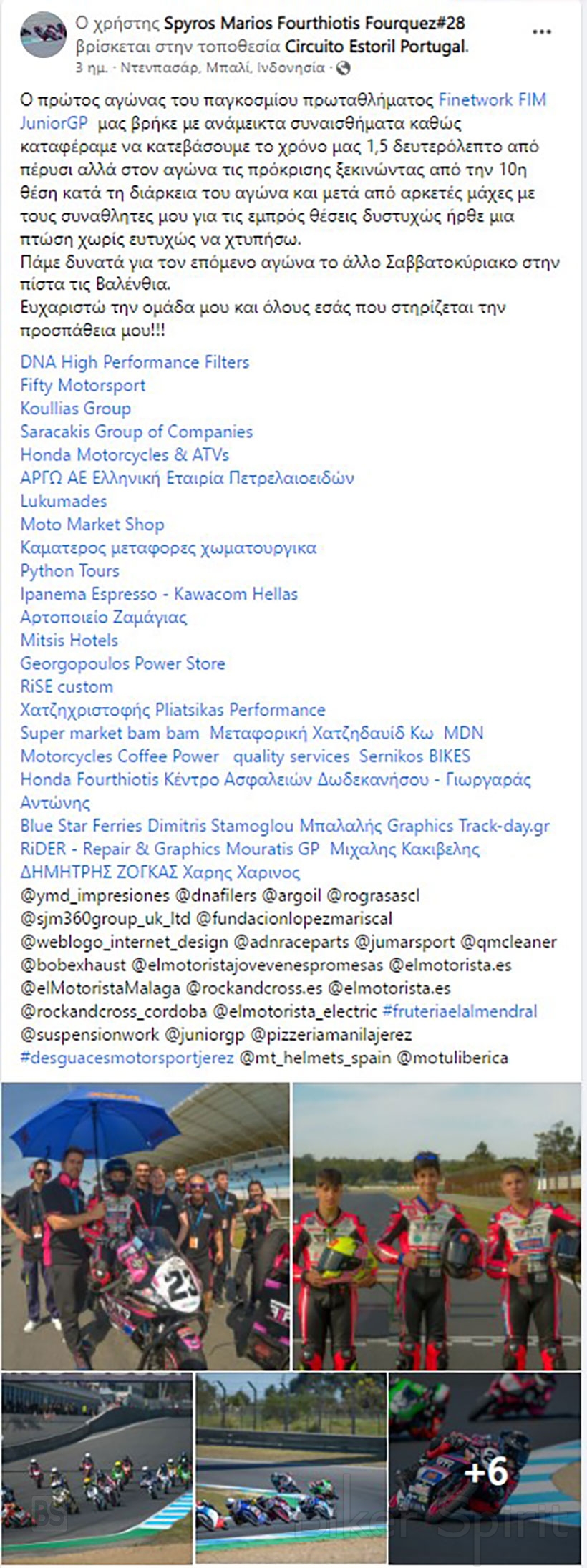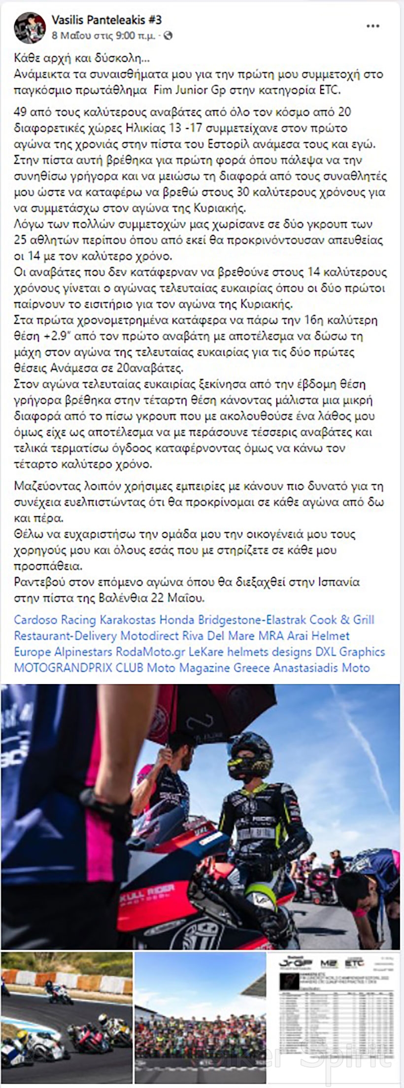 Ο πρώτος αγώνας του παγκοσμίου πρωταθλήματος Finetwork FIM JuniorGP μας βρήκε με ανάμεικτα συναισθήματα καθώς καταφέραμε να κατεβάσουμε το χρόνο μας 1,5 δευτερόλεπτο από πέρυσι αλλά στον αγώνα τις πρόκρισης ξεκινώντας από την 10η θέση κατά τη διάρκεια του αγώνα και μετά από αρκετές μάχες με τους συναθλητές μου για τις εμπρός θέσεις δυστυχώς ήρθε μια πτώση χωρίς ευτυχώς να χτυπήσω.