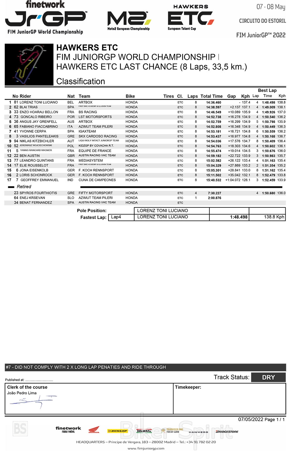 Στον αγώνα τελευταίας ευκαιρίας ξεκίνησα από την έβδομη θέση γρήγορα βρέθηκα στην τέταρτη θέση κάνοντας μάλιστα μια μικρή διαφορά από το πίσω γκρουπ που με ακολουθούσε ένα λάθος μου όμως είχε ως αποτέλεσμα να με περάσουνε τέσσερις αναβάτες και τελικά τερματίσω όγδοος καταφέρνοντας όμως να κάνω τον τέταρτο καλύτερο χρόνο.