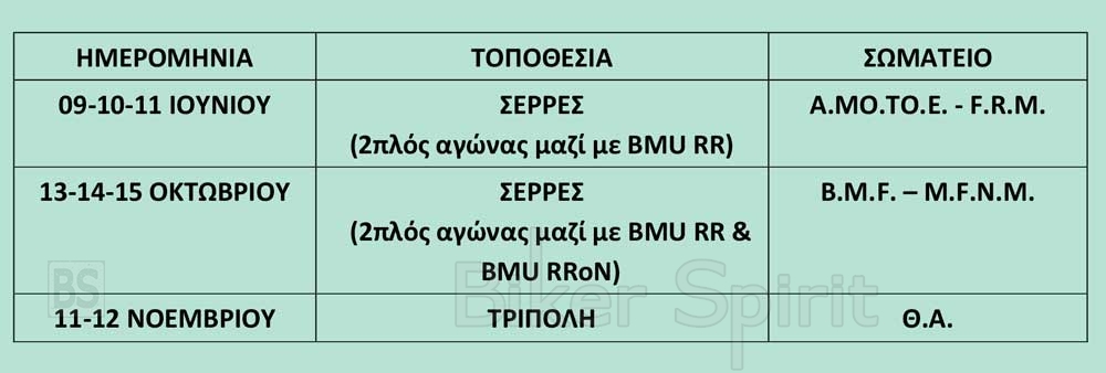 - ΝΕΩΝ: Πρωτάθλημα για αθλητές 13-20 ετών.Για τις αθλήτριες το μέγιστο όριο αυξάνεται κατά 5 έτη (13-25 ετών).Μοτ/τες µε έγκριση τύπου δρόµου 248-500 4Τ μέχρι 2 κυλίνδρους.
