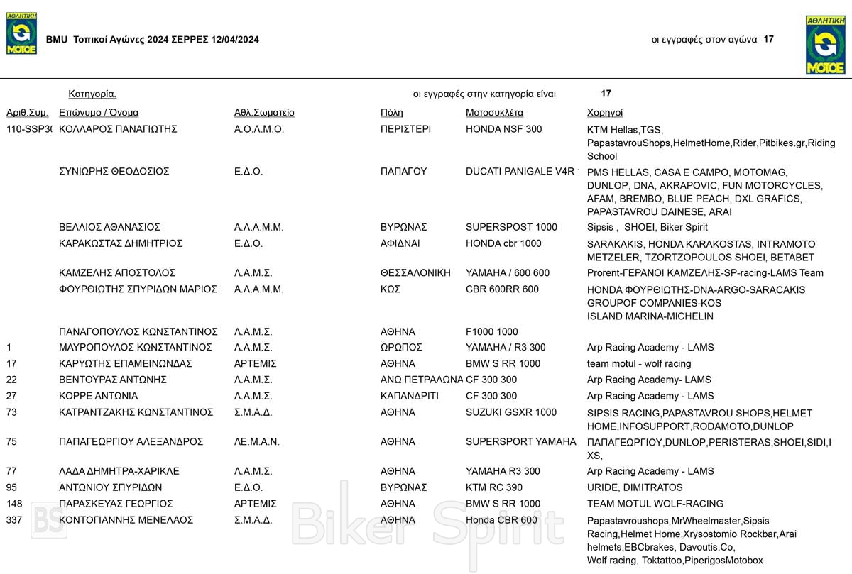 114 οδηγοί θα συμμετέχουν στις κατηγορίες SSP600-STK600, SSP300, SBK-STK1000, F1000, F600, CF MOTO-SP 125 και MOTO CLASSIC, με 17 από αυτές τις συμμετοχές να είναι από την Ελλάδα.