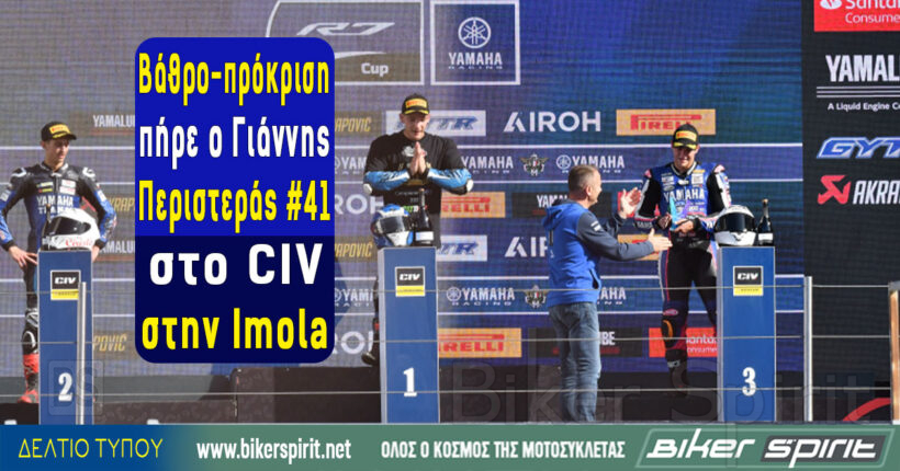 Χρειάστηκε να περιμένουμε μέχρι τον 7ο και τελευταίο Αγώνα του Ιταλικού Πρωταθλήματος CIV, στην κατηγορία Yamaha R7 Cup, για να πάρει το πρώτο φετινό βάθρο και μαζί να σφραγίσει την πρόκρισή του στον Πανευρωπαϊκό Τελικό του θεσμού, ο 20χρονος Έλληνας οδηγός Γιάννης Περιστεράς, που δεν είχε την τύχη με το μέρος του στους προηγούμενους Αγώνες της χρονιάς.